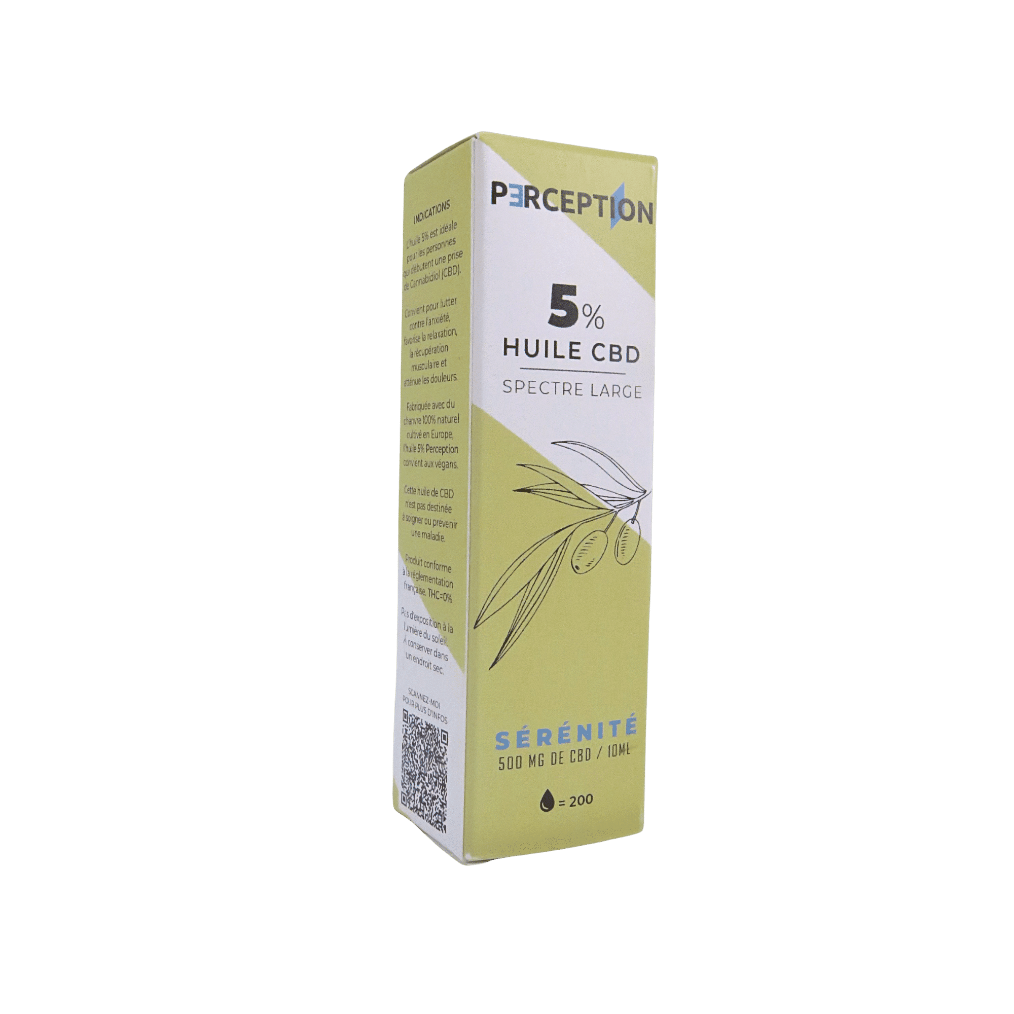 L’huile de CBD  5%  à spectre large – PERCEPTION –contient du CBD, CBG, des terpènes, flavonoïdes ainsi que des Oméga 3,6,9… Cette association renforce l’efficacité du CBD sur votre corps car elle procure un “effet d’entourage”. L’effet d’entourage est la manière dont les différents composés du chanvre interagissent pour créer des synergies qui donnent à la plante ses propriétés spécifiques : anti-inflammatoires, relaxation, récupération sportive, sommeil…