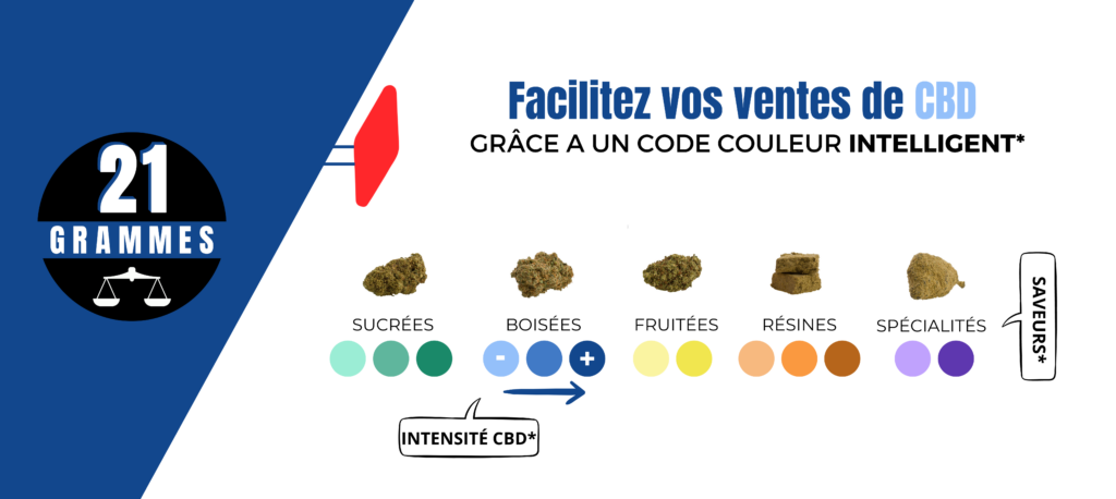 L’originalité de notre gamme CBD repose sur un code couleur malin qui permet de simplifier la vente au comptoir.